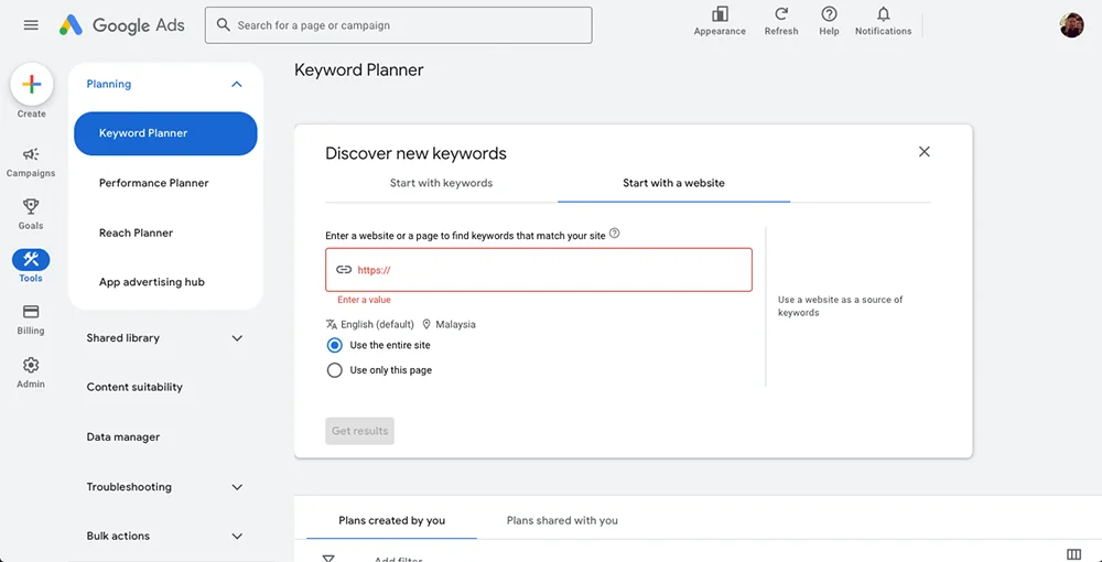 • Optionally, enter a website URL (yours or a competitor’s) to get keyword ideas related to that site.