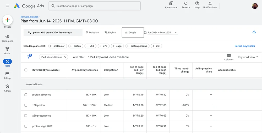 • Apply filters such as minimum average monthly searches to exclude low-volume keywords.